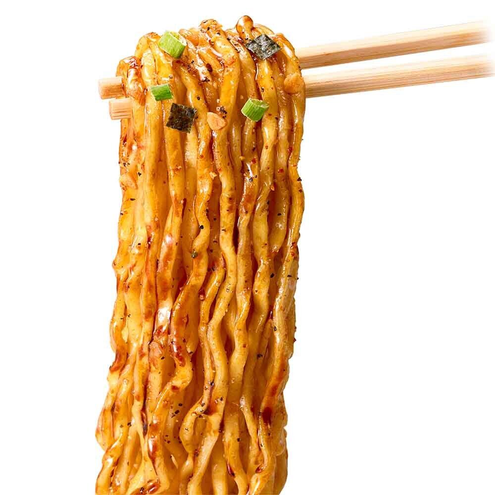 もっちりとしながらも麺中心の弾力を強めたガッツリ食べごたえのある極太麺130gに、ごま油香る濃厚焼豚醤油ダレがしっかりと絡むこってりで濃厚な味わいがお楽しみいただけます。